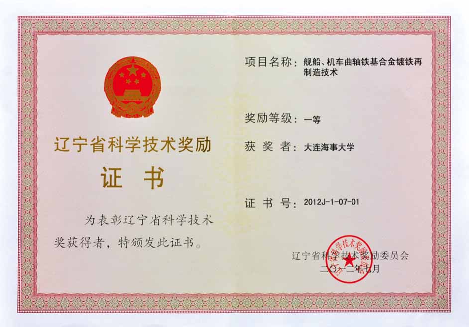 ◆ 2012年 “艦船、機車曲軸鐵基合金鍍鐵再制造技術”獲得遼寧省科技進步一等獎;